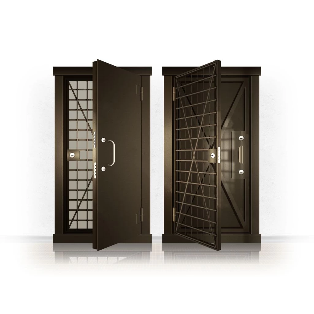 Металлические двери КХО и КХН представляют собой входные блоки, обладающие высоким уровнем взломостойкости и состоят из трех основных элементов: усиленного каркаса, сплошного металлического полотна и решетчатой двери. Дверной блок изготавливается из стального уголка 100*100 мм. Места крепления блока к стене цементируются и закрываются стальными наличниками шириной 40 мм. Крепеж заходит вглубь стены на 80 мм. В конструкции внешней створки монтируются ребра жесткости, для обшивки используется сталь толщиной не менее 3 мм. Внутренняя решетка изготавливается из прутка диаметром 16 мм. Размер ячеек решетки должен составлять не более 15 на 15 см. В точках пересечения прутья надежно приваривают друг к другу. В КХО и КХН необходимо поддерживать определенную температуру и влажность. Для этого внутреннее пространство глухой двери заполняется теплоизоляционным материалом, а по периметру двери приклеивается уплотнитель. Такие двери оборудуются замками с повышенным уровнем взломостойкости. Специализированные двери КХО и КХН в Донецке могут быть оснащены сигнализацией, в конструкции могут быть проушины для навесного замка и элементами для опечатывания. Если идет речь о двери в комнату хранения оружия, в створке оборудуется окно для выдачи оружия и спец. средств, которое накрывается стальной дверцей.