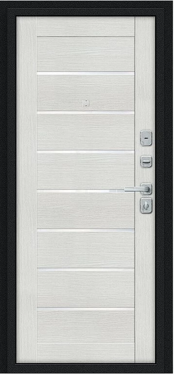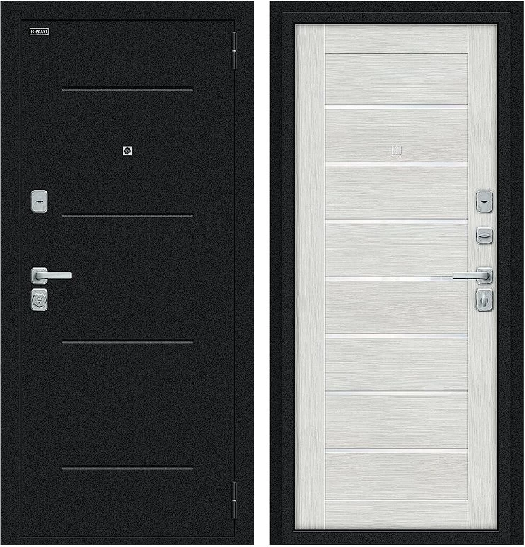 Надежная входная Дверь Браво Техно/BChrome Букле черное/Bianco Melinga премиум класса по цене 34 819 руб. Большая толщина стали защитит от проникновения в ваш дом, квартиру или коттедж. Используется очень качественная фурнитура: замки, цилиндры, ручки, защелки. Покрытие и отделка двери изготовлено под внимательным контролем производителя. Дверь имеет долгий срок службы и гарантию.